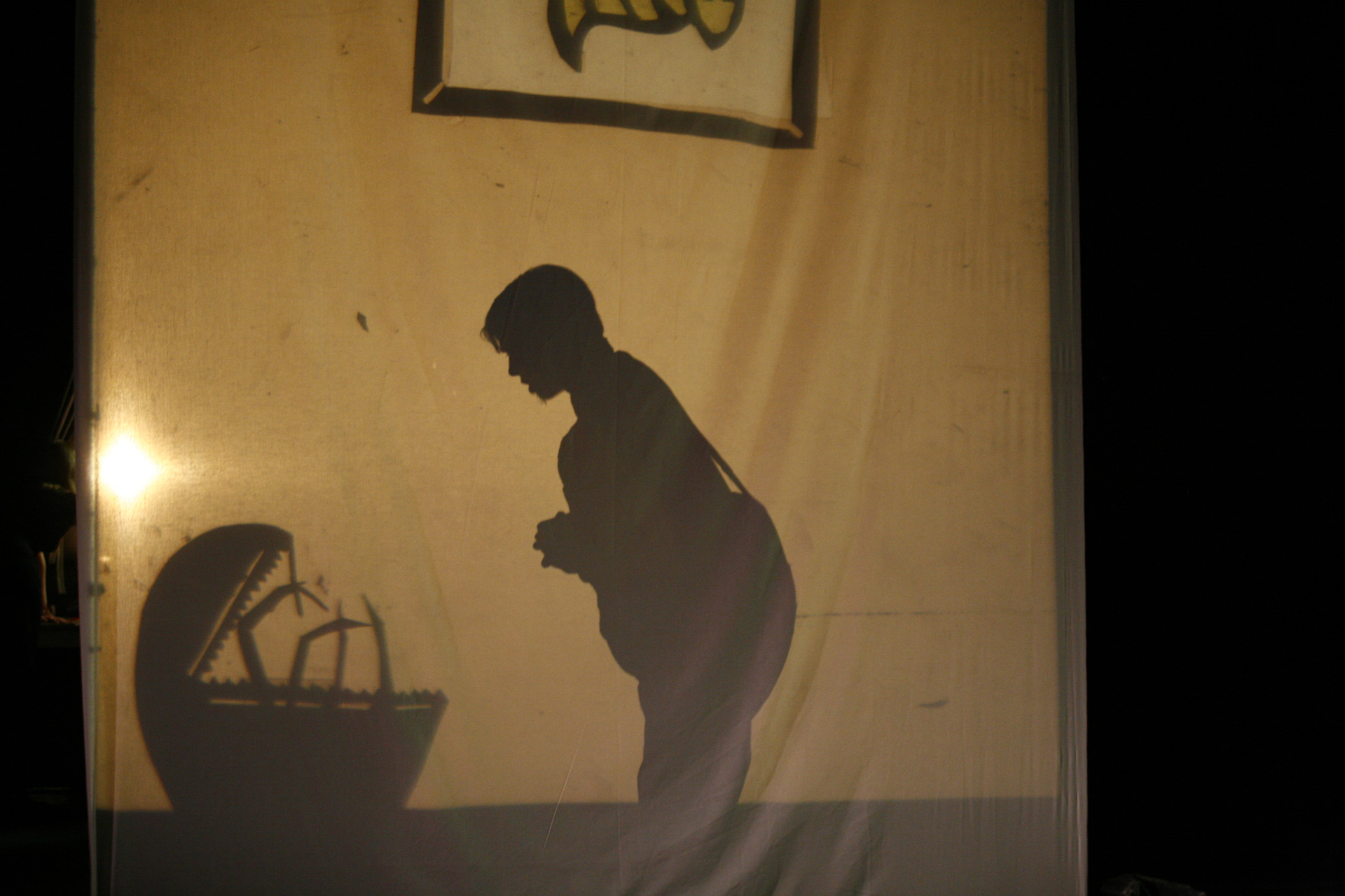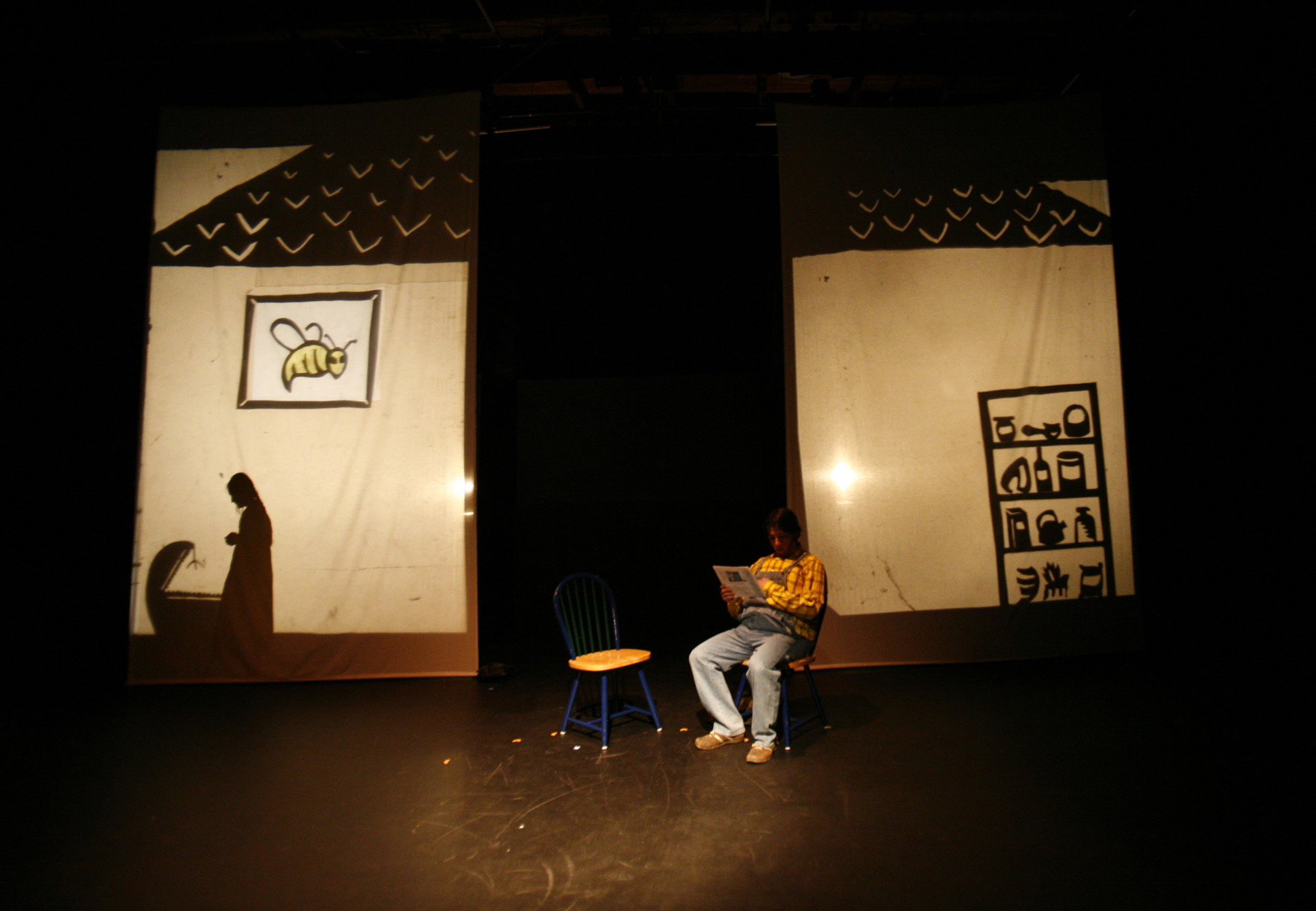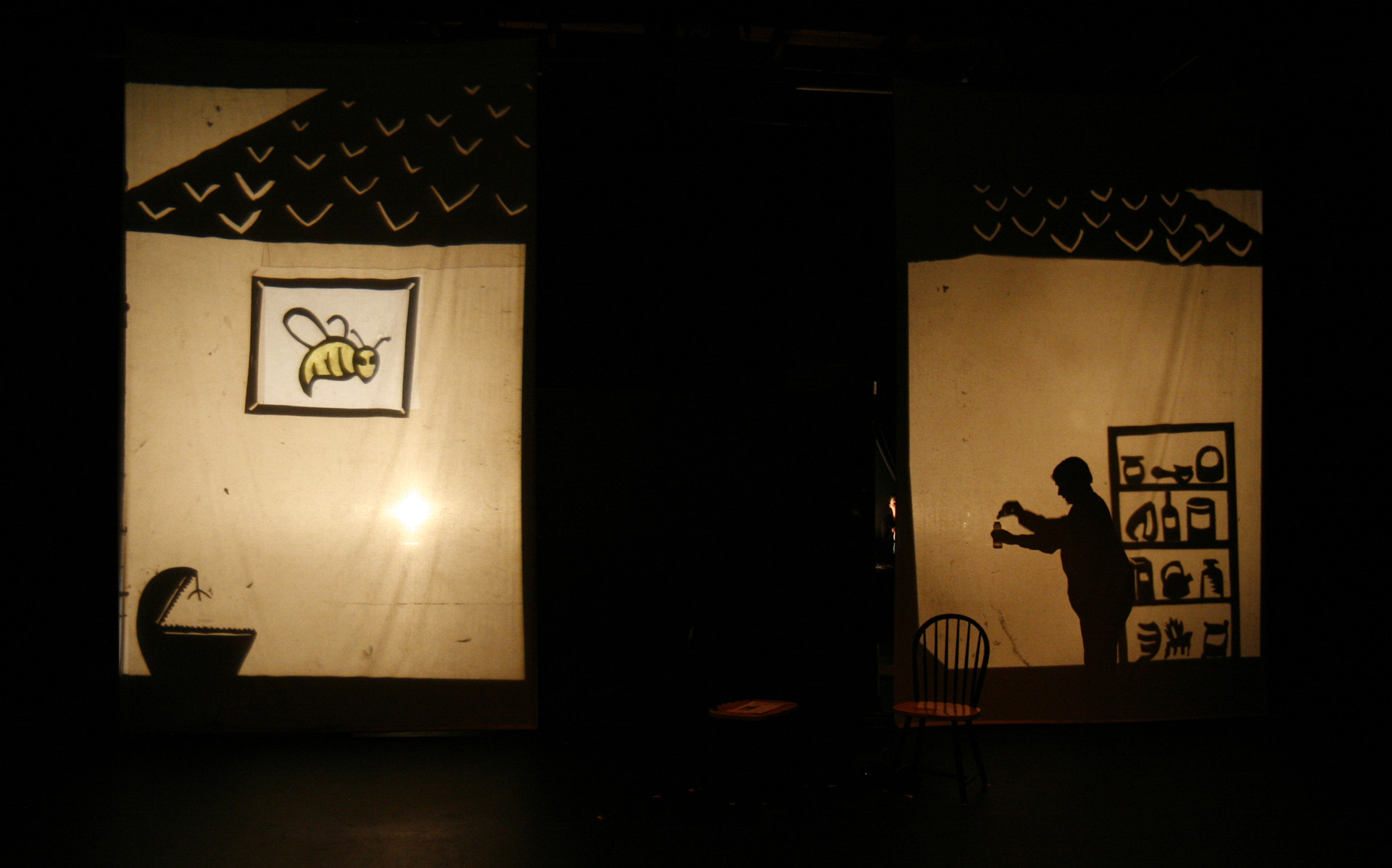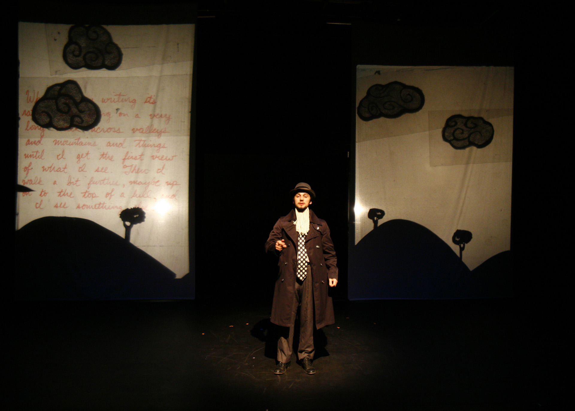 This was my first real introduction to shadow puppetry, overhead projectors, and directing large ensembles. Working with 3-dimensional actors projecting shadows onto a 2-dimensional screen, while choreographing the puppeteer's actions to interact with the actor's shadows, was so interesting to me that I have been exploring the form ever since.