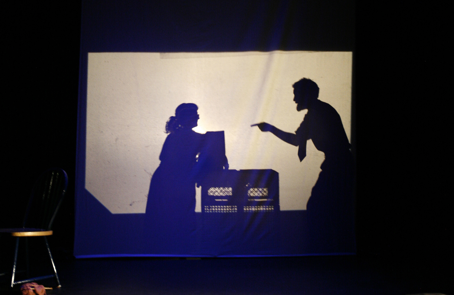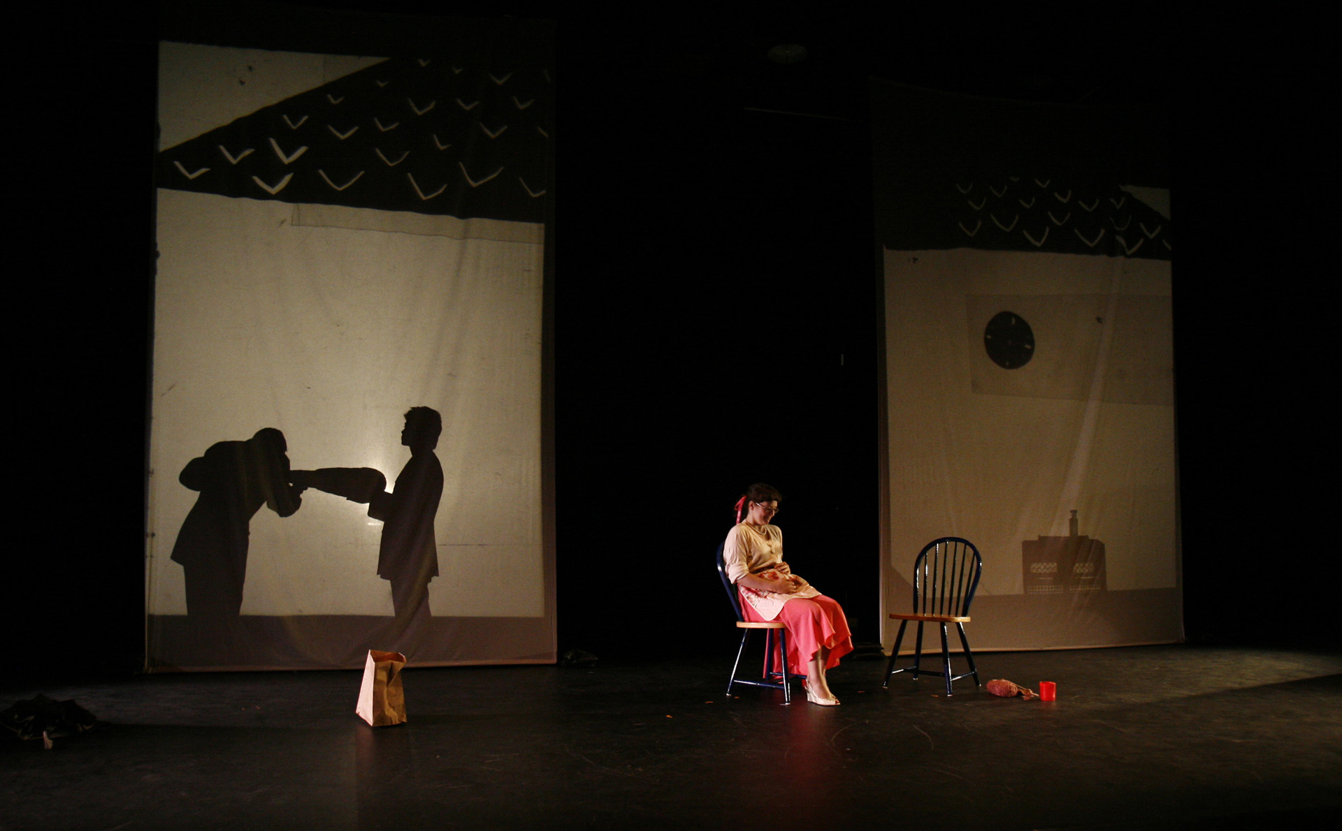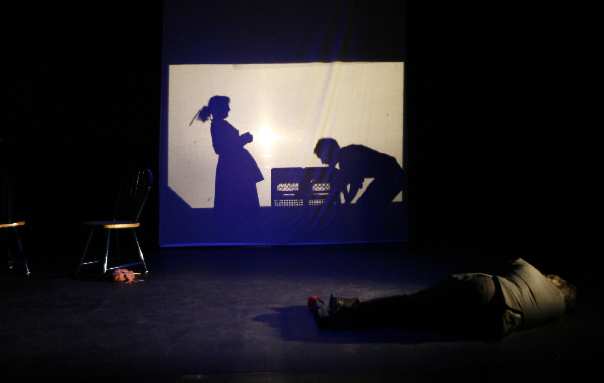 This was my first real introduction to shadow puppetry, overhead projectors, and directing large ensembles. Working with 3-dimensional actors projecting shadows onto a 2-dimensional screen, while choreographing the puppeteer's actions to interact with the actor's shadows, was so interesting to me that I have been exploring the form ever since.